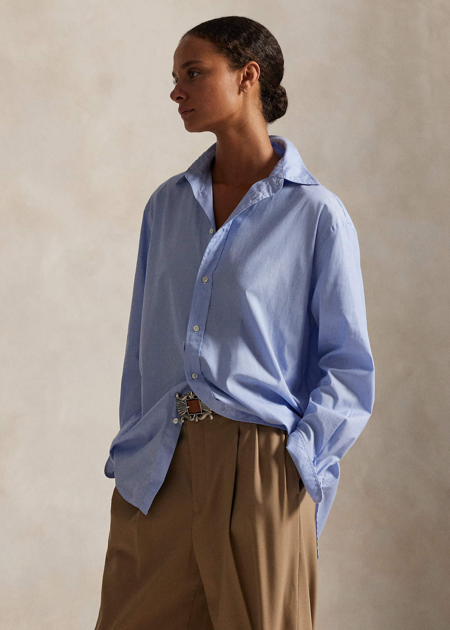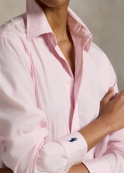 - Long sleeves with buttoned barrel cuffs. Dropped shoulders. Box-pleated back yoke with a locker loop. Shirttail hem.