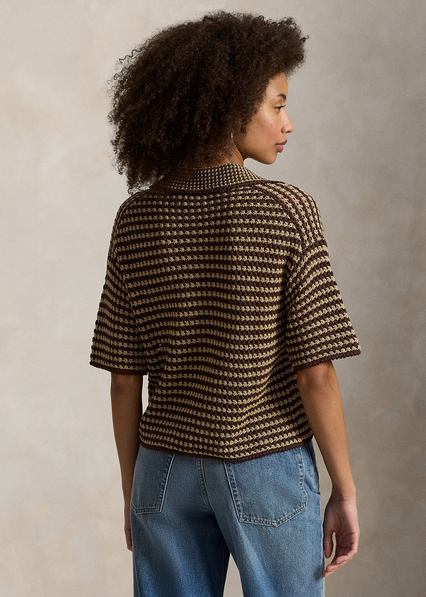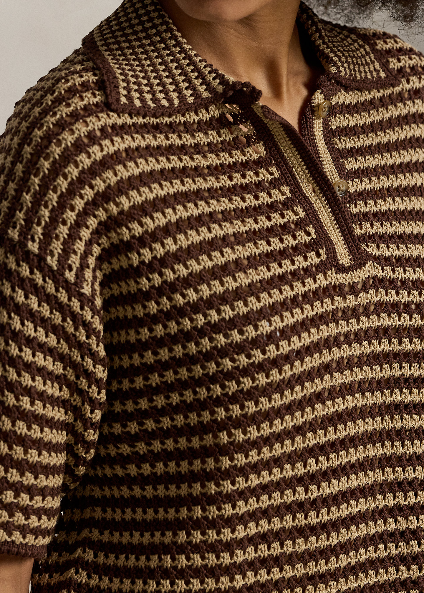 - Spread collar with crocheted scalloped trim. Seed-stitched two-button placket.